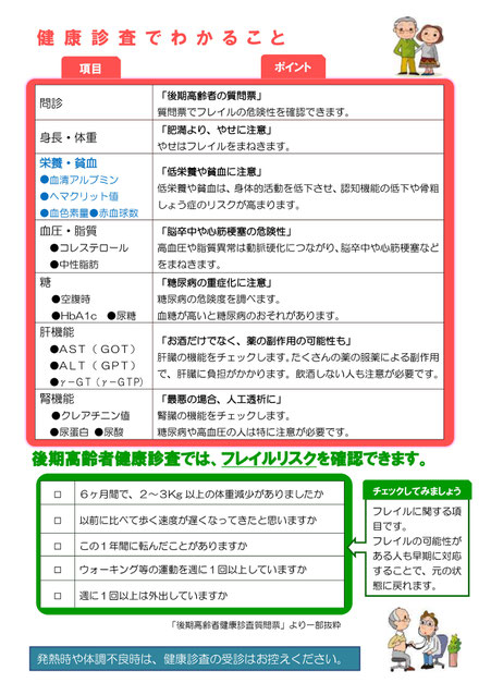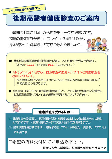 健康で豊かな人生をお送り頂く為にも、当院では後期高齢者への特定健診を推奨しております。