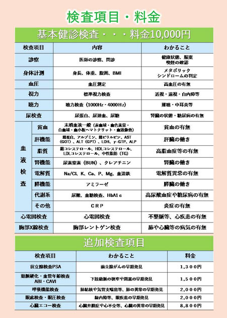 検査項目・・・末梢血液一般(赤血球・血色素量・白血球・血小板ヘマトクリット・血液像他) 肝機能検査・・総蛋白・アルブミン・総ビリルビン・AST(GOT)・ALT(GPT)・LDH・γ-GTP・ALP 脂質検査・・・総コレステロール・HDLコレステロール・LDLコレステロール・中性脂肪(TG) 腎機能検査・・尿素窒素(BUN)・クレアチニン 電解質検査・・Na/Cl・K・Ca・P・Mg・血清鉄 膵機能検査・・アミラーゼ 代謝系検査・・尿酸・血糖検査・HbA1c その他検査・・CRP |